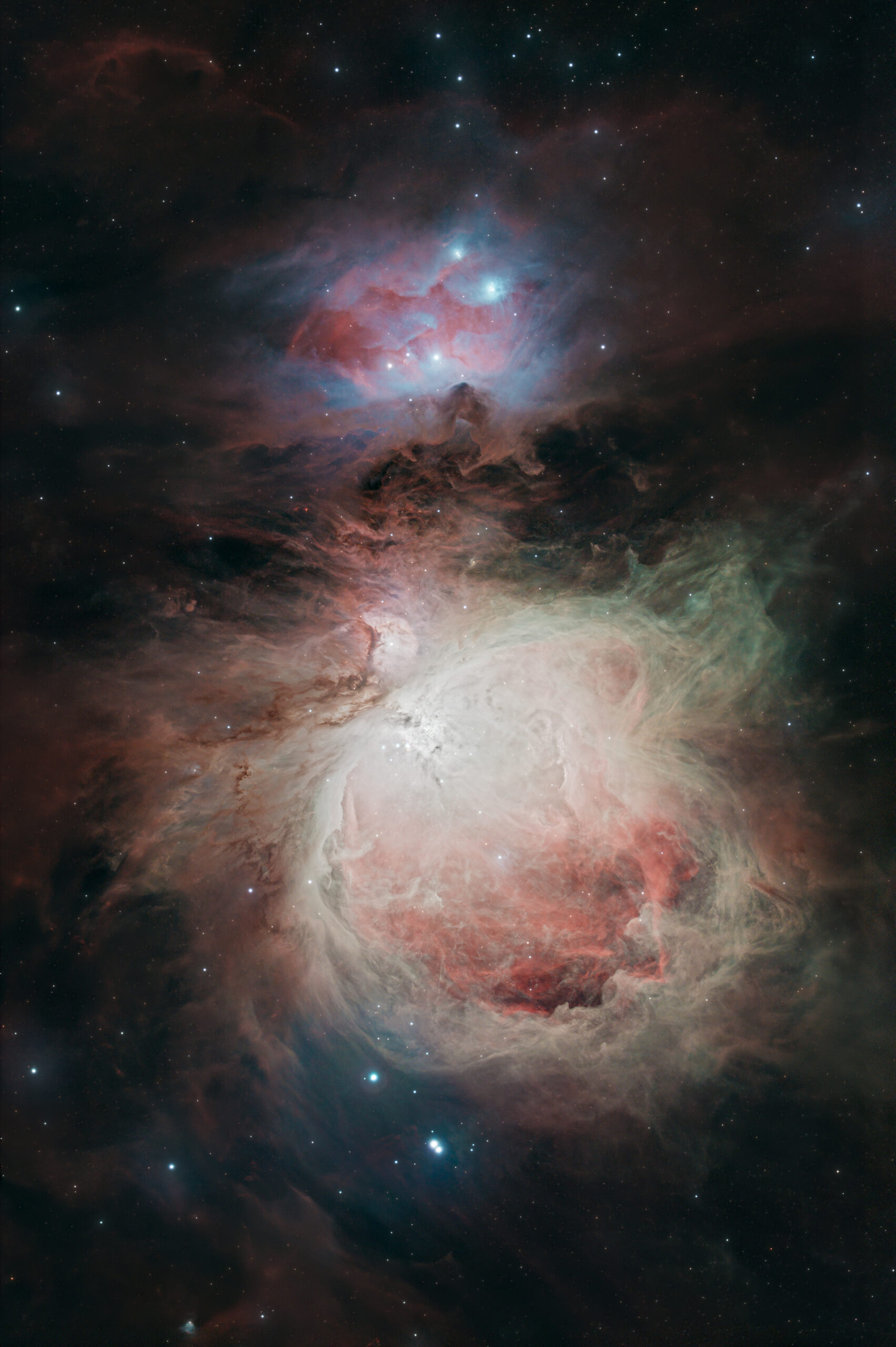 La nébuleuse d’Orion, ou M42, est une vaste nébuleuse diffuse située à environ 1 344 années‑lumière dans la constellation d’Orion. Visible à l’œil nu comme une tache floue dans l’« épée » du chasseur, elle constitue la région de formation d’étoiles massives la plus proche de la Terre. Large d’environ 25 années‑lumière et riche d’environ 2 000 masses solaires de gaz et de poussières, M42 abrite le célèbre amas du Trapèze, dont les jeunes étoiles illuminent et sculptent le nuage environnant. Cette pouponnière stellaire, intensément étudiée, révèle des phénomènes essentiels à la naissance des systèmes planétaires : disques protoplanétaires, naines brunes, jets stellaires et turbulences du gaz. Grâce aux observations modernes, notamment celles du télescope spatial Hubble puis du James Webb, M42 demeure un laboratoire privilégié pour comprendre comment naissent les étoiles et les planètes.